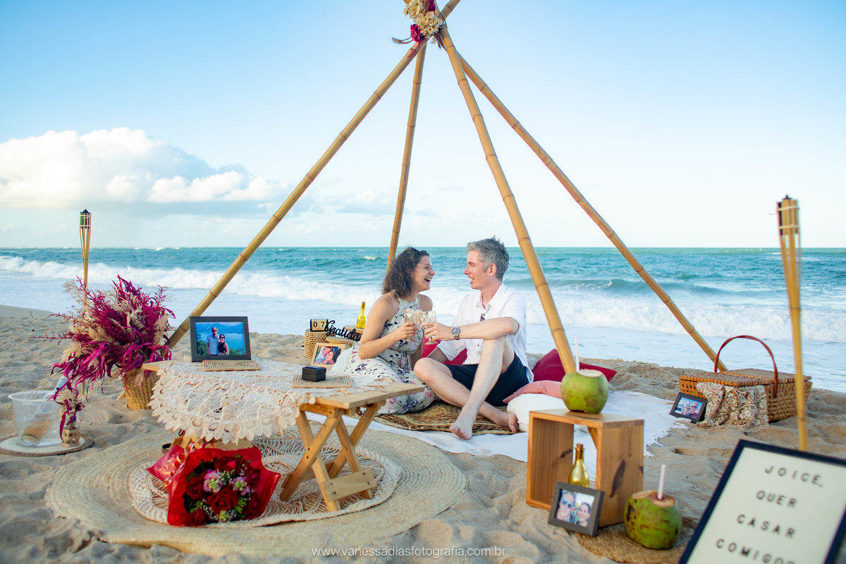 Matt es inglés pero vive en Suiza y nos encontró a través de Google para organizar una propuesta de boda sorpresa para su entonces novia brasileña, Joice. Tuvimos un servicio bilingüe y pensamos juntos cómo sería este momento. La propuesta tuvo lugar en la playa de Porto de Galinhas, en una tarde con una espectacular puesta de sol. Después de la propuesta, también hicimos una sesión de fotos con los rostros de la pareja, en medio del cocotal de Maracaipe, y luego junto al mar.